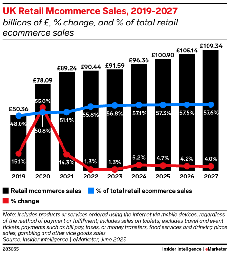 Mcommerce is a crucial channel for UK ecommerce: Almost 60% of online sales will take place on mobile devices in 2023. Sales growth is slowing as consumers cut discretionary spending. But mobile continues to outpace the overall ecommerce market as people turn to their smartphones for savings and social media transforms Gen Z buying habits.