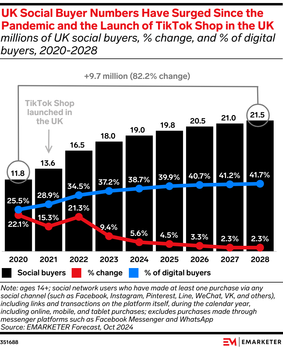 Key Stat: There will be 21.5 million social buyers in the UK by 2028—up 82.2% from 11.8 million in 2021.