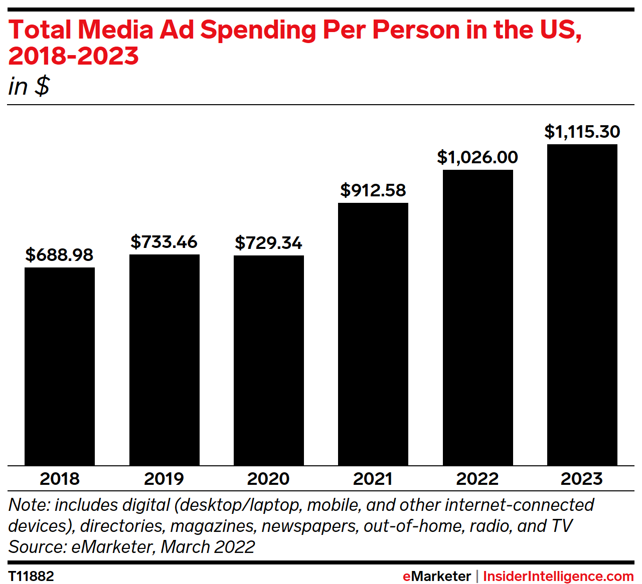 KEY STAT: US ad spending per person will exceed $1,000 in 2022, rising more than 8% next year.