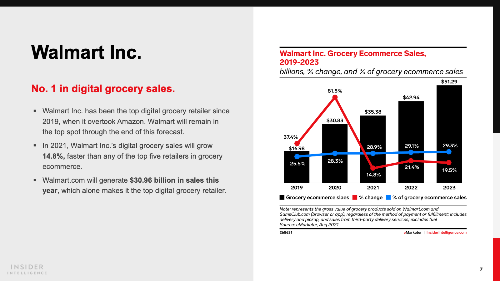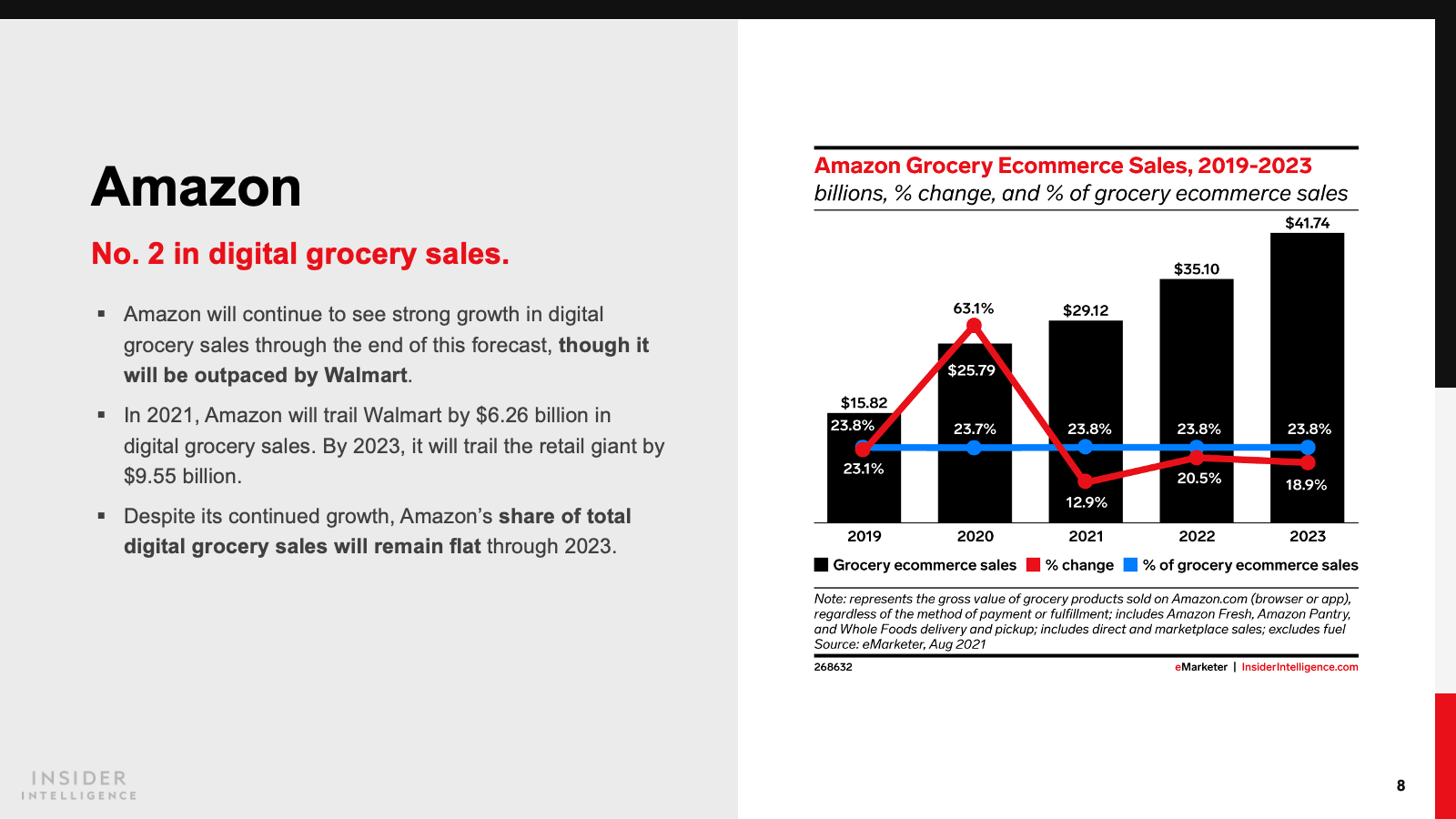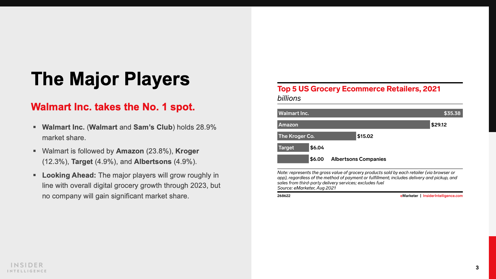 Walmart Inc. commands the leading share of digital grocery sales in the US with 28.9% market share this year, followed by Amazon (23.8%), The Kroger Co. (12.3%), Target (4.9%), and Albertsons Cos. (4.9%).