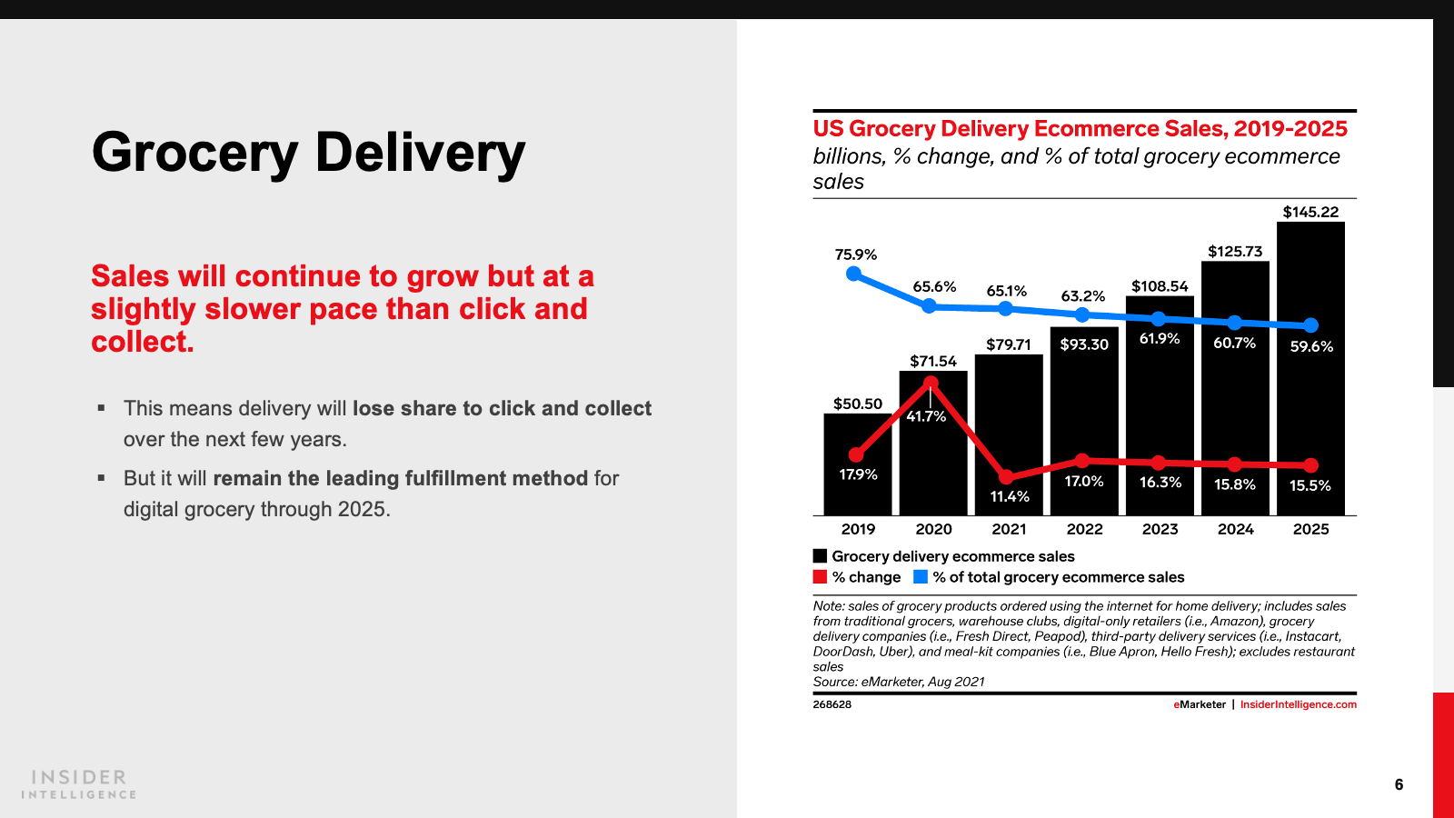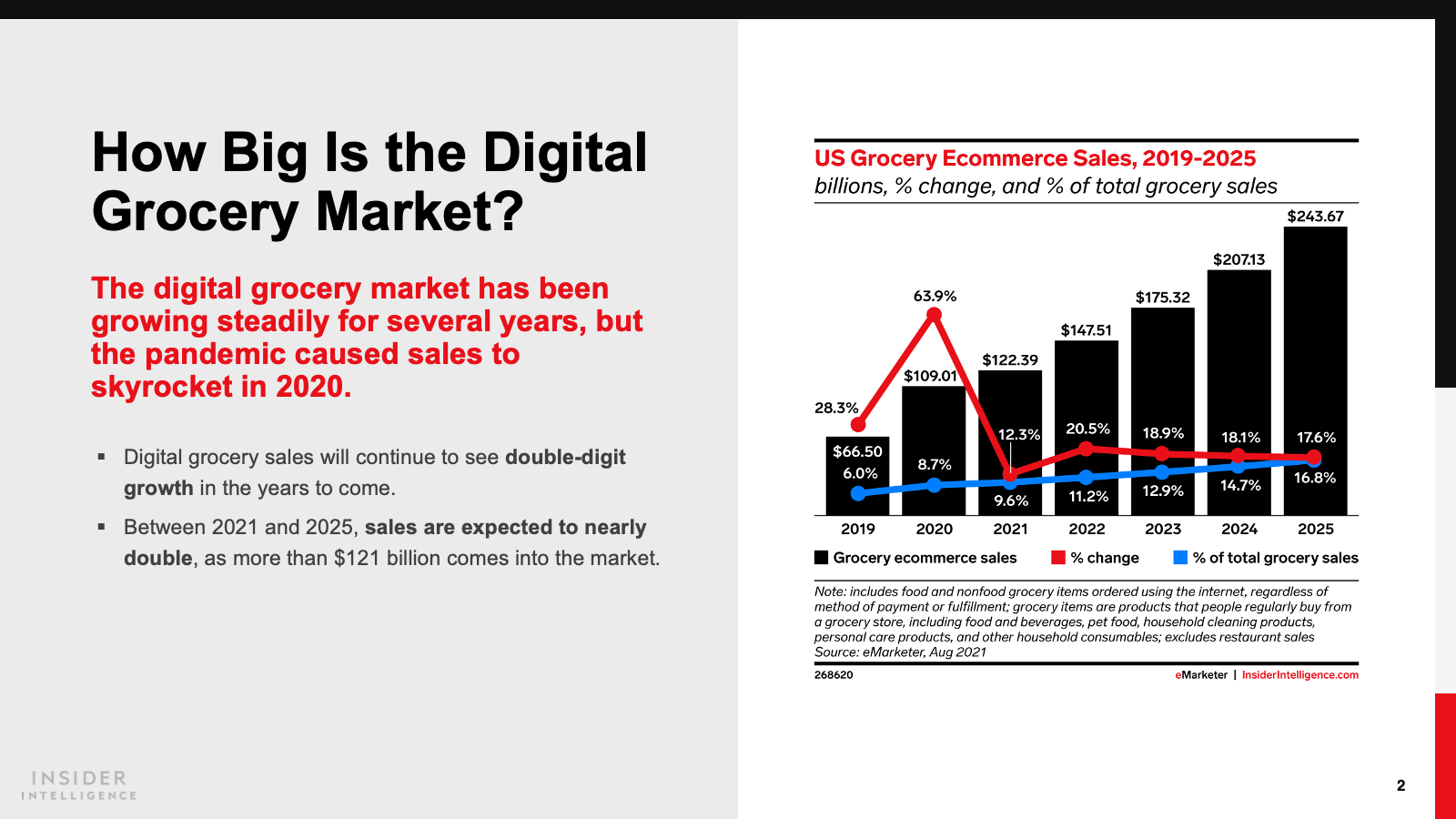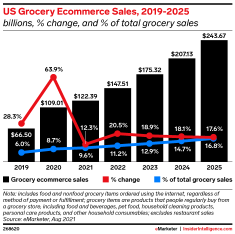 KEY STAT: US digital grocery sales grew 63.9% in 2020 and will grow another 12.3% this year, reaching $122.39 billion. Sales will nearly double by 2025, reaching $243.67 billion.