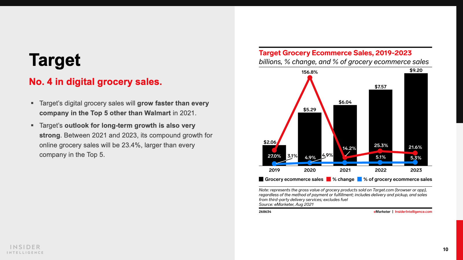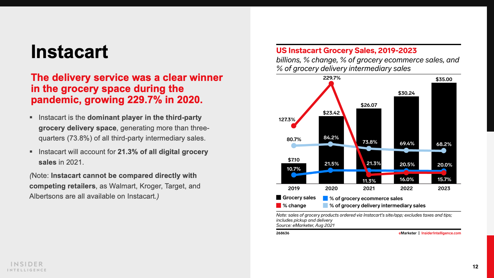 Delivery through third-party intermediaries will make up 28.8% of digital grocery sales in 2021. Instacart is the dominant player with 73.8% of third-party intermediary grocery sales and will generate $26.07 billion in sales this year.