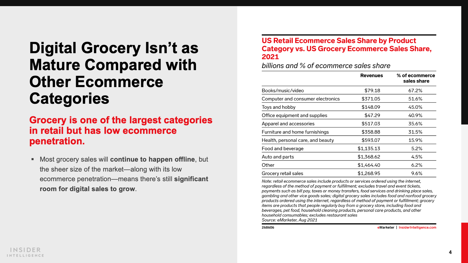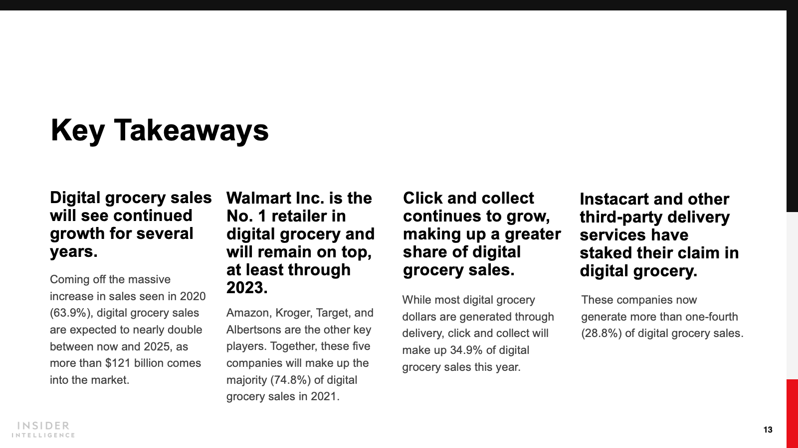 The pandemic caused digital grocery sales to skyrocket. As the market matures, key players are vying for dominance, which is driving trends like click and collect and partnerships with third-party delivery services.