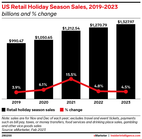 KEY STAT: Last year, holiday season retail sales grew by 4.8% YoY, following two years of surging retail and ecommerce growth. We expect a similar gain of 4.5% for the 2023 holiday season.