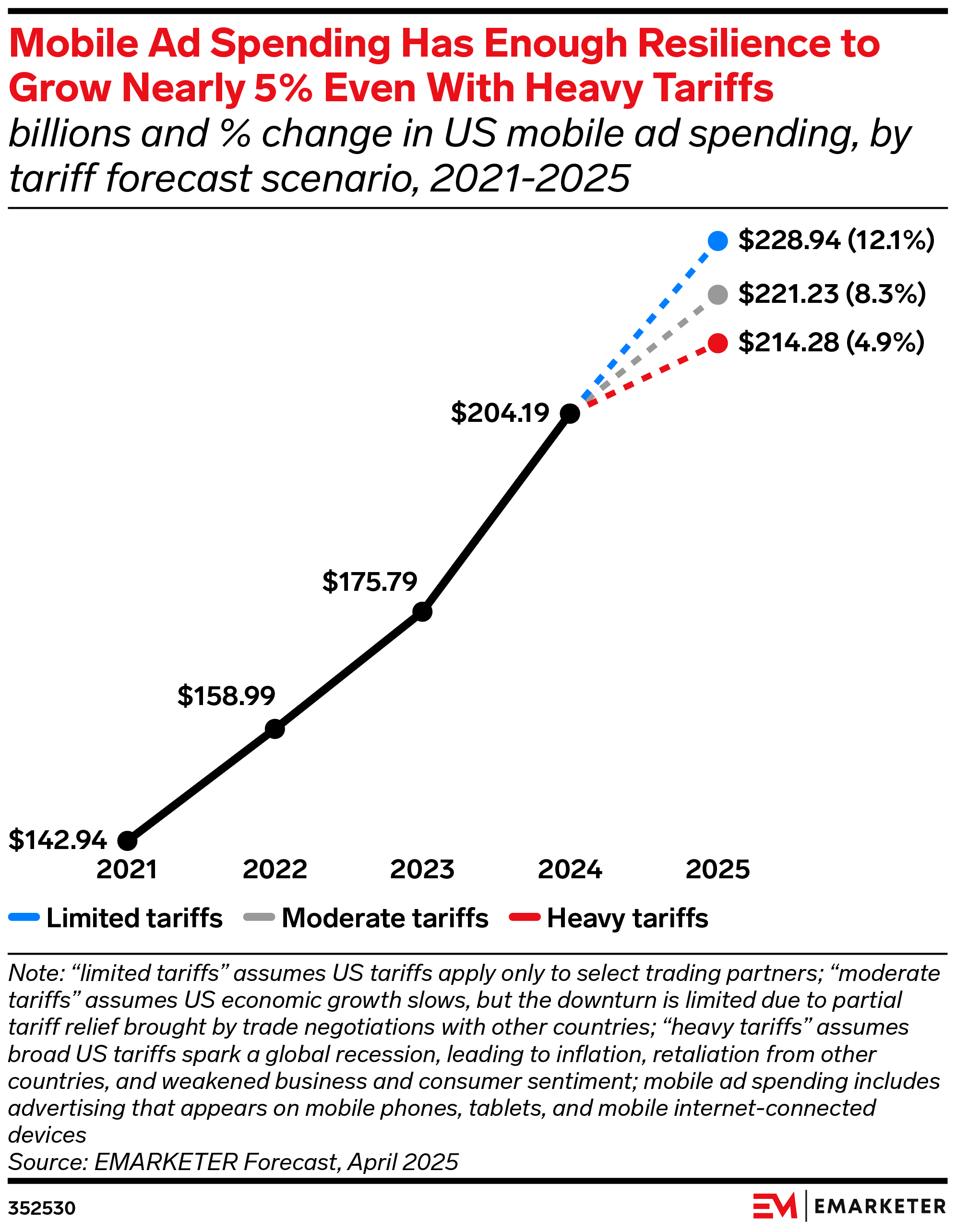 Key Stat: Mobile advertising spending will grow in 2025, but heavy tariffs would take a roughly $14 billion bite out of growth seen under limited tariffs.
