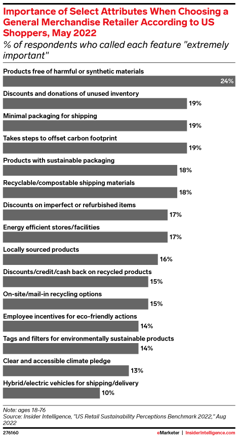 KEY STAT: The most popular sustainability feature is a selection of products free of harmful or synthetic materials with 24% of respondents considering it “extremely important” when choosing a general merchandise retailer.