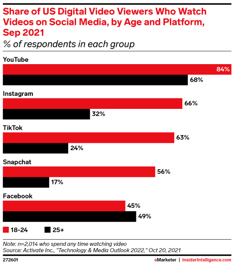 KEY STAT: The percentage of young US digital video viewers who watch video on Instagram and TikTok is within shouting distance of YouTube.