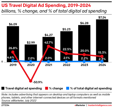 KEY STAT: The travel industry will spend 22.5% more on digital advertising this year than in 2021. Only one other industry will increase spending faster (retail), but travel will remain the smallest spender among the industries we track.