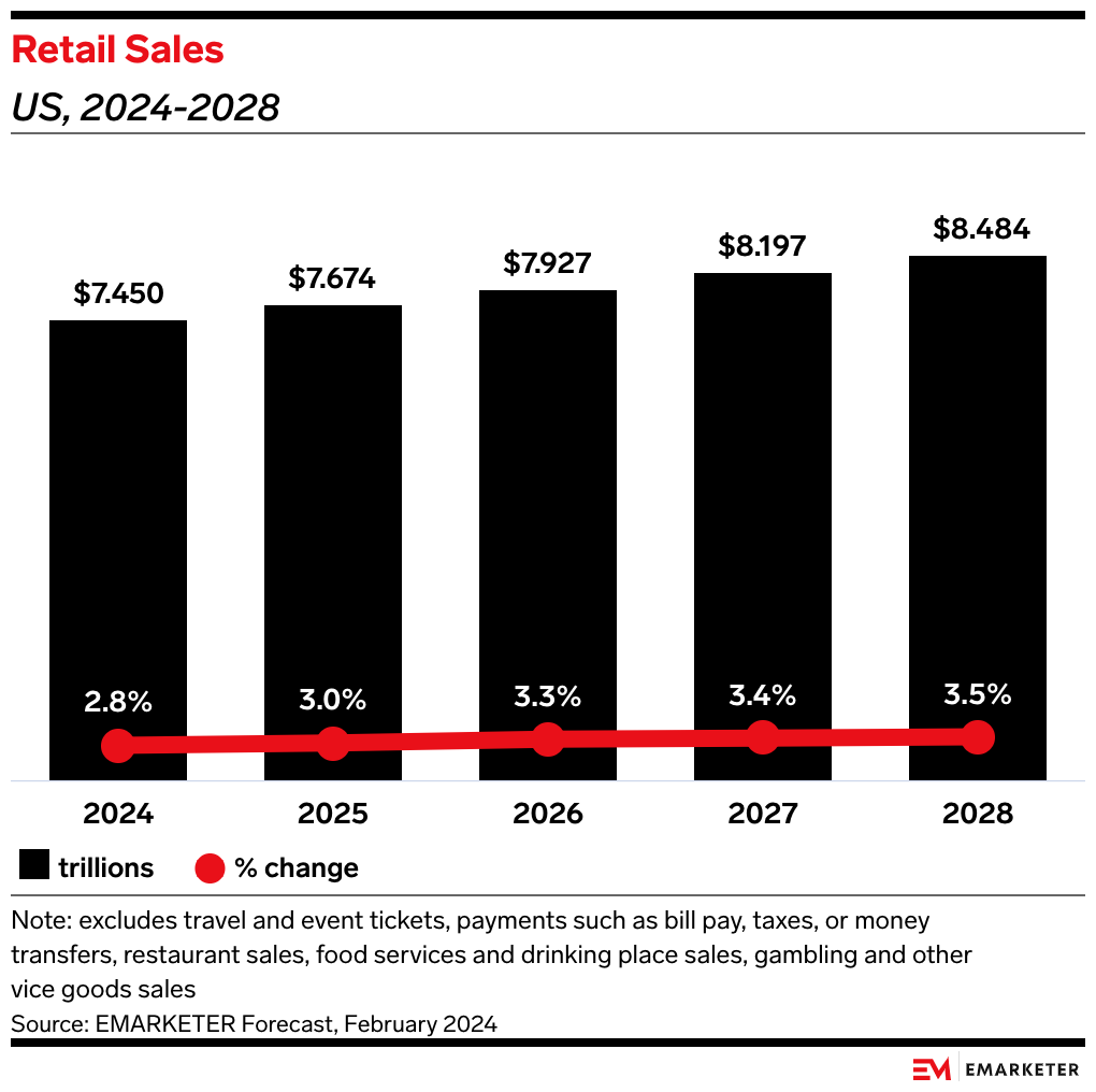 - Our forecast expects US retail sales to grow by 2.8%, an acceleration from last year’s 2.1%.