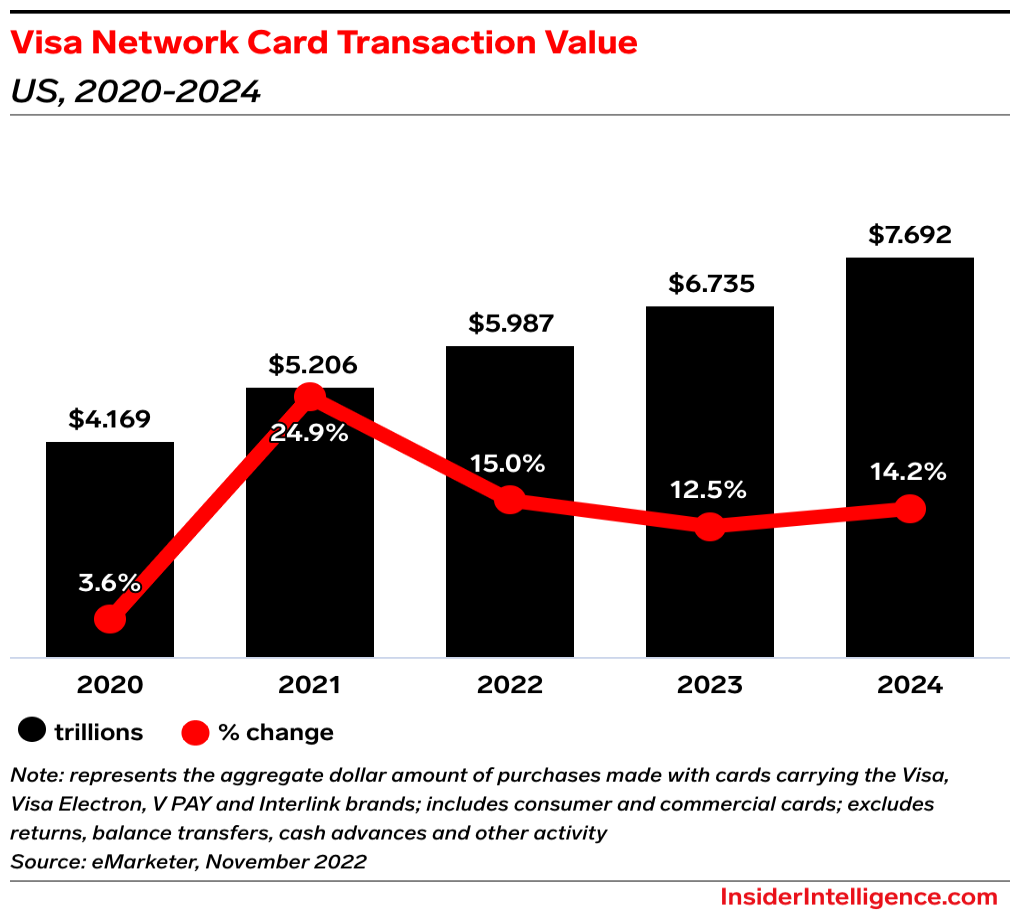 By the numbers: Visa’s payments volume grew 7% year over year (YoY) in its fiscal Q1 2023 (ended December 31, 2022), per its earnings release. Growth slowed from the post-lockdown 20% YoY increase the same period a year ago.