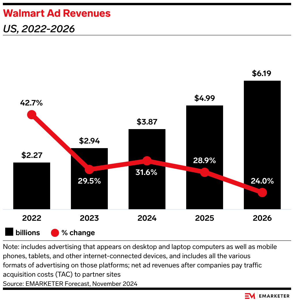 • Walmart, which generated $4.4 billion in global ad revenues last year (with $3.87 billion from the US, per our forecast), currently brings in most of its ad revenues from large consumer packaged goods brands.