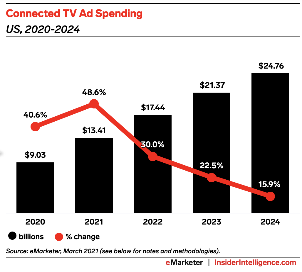 - Why it matters: CTV will be a top-priority venue for advertisers this year, with over half (54%) of US digital media professionals naming it a leading priority for 2021, per an October 2020 survey by Integral Ad Science. We estimate that US CTV ad spend will grow even faster this year than last, up 48.6% year over year (YoY) to $13.41 billion.