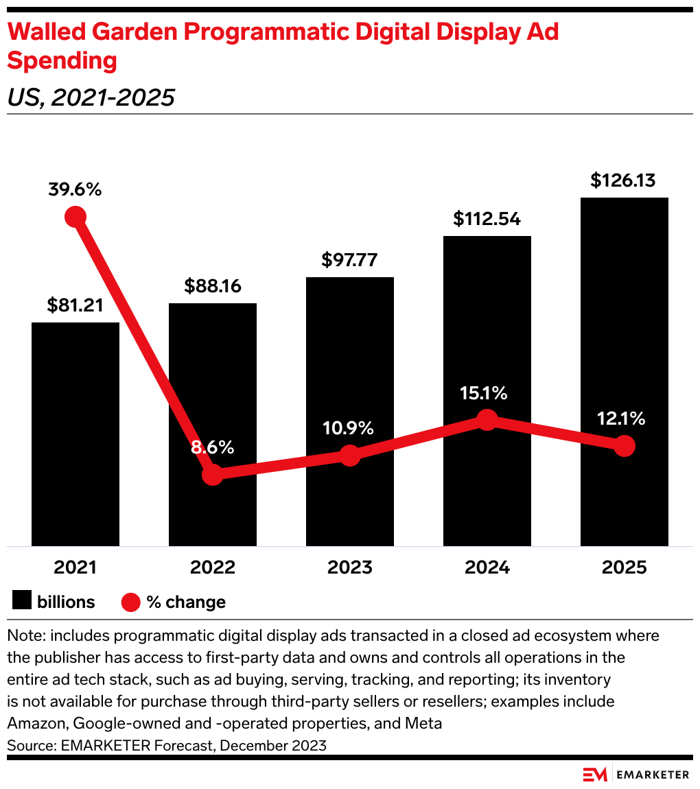Our take: As distrust of major ad platforms rises and the industry takes a more open-ended approach, walled gardens are likely to see their share of ad spending diminish.