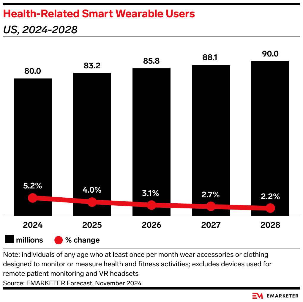 Key stat: Omnia's unveiling comes as consumers are hitting peak adoption rates for health-related smart devices, including wearables. 80 million Americans currently use a health-focused smart wearable, and we project 90 million to use one by 2028.