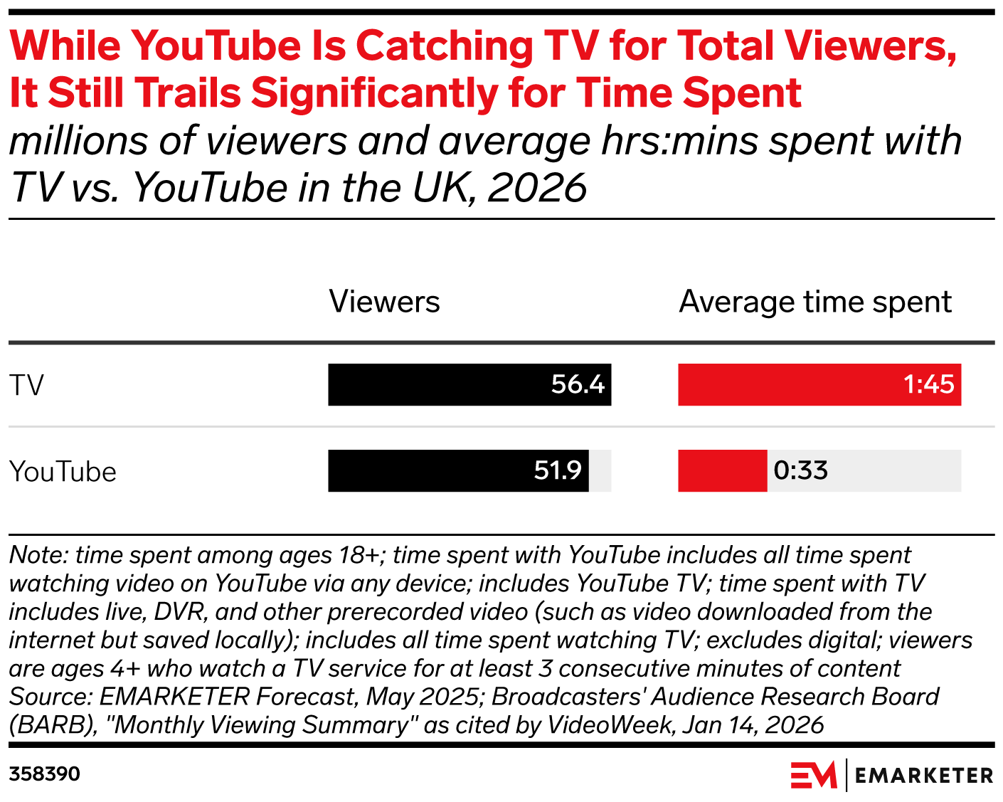 Key Stat: YouTube viewer numbers are getting close to total live TV viewers, but daily time spent with TV beats out YouTube time by over an hour.