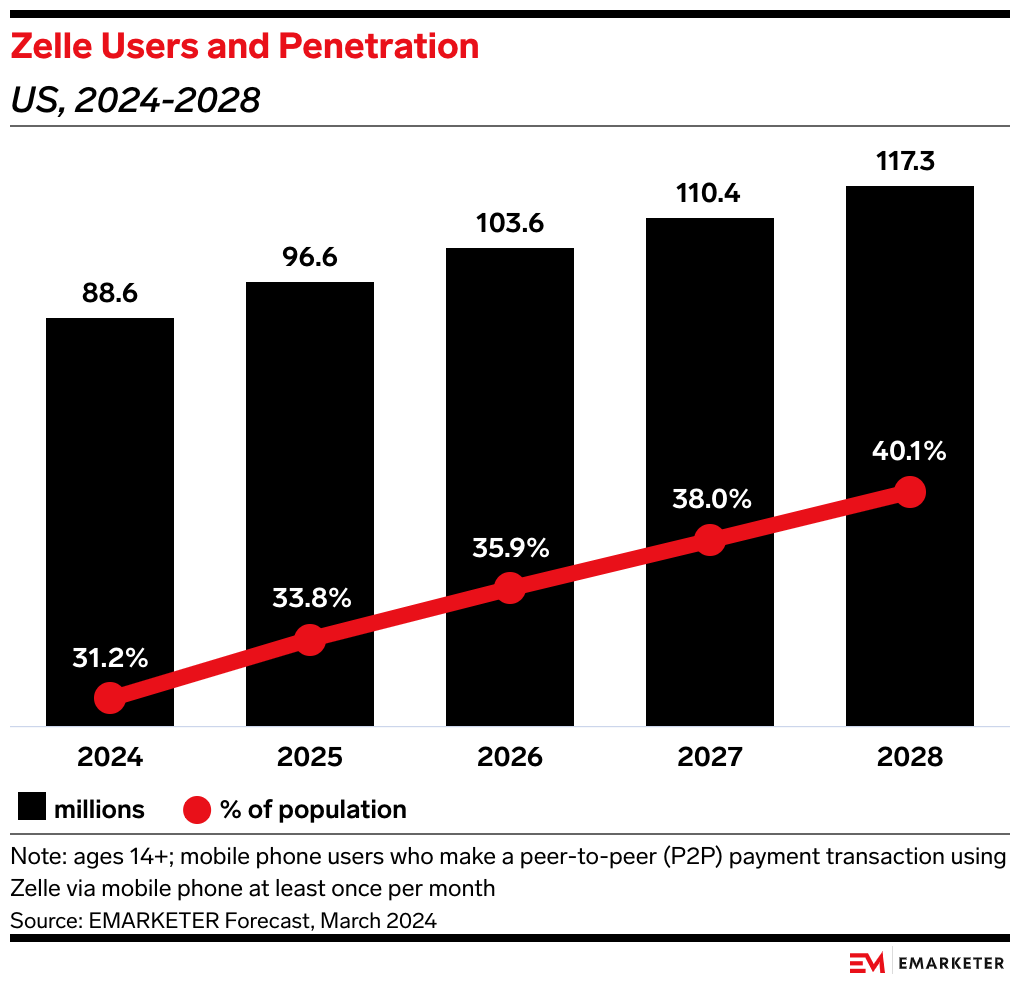 But regardless of what happens with this lawsuit, Zelle’s continual fraud concerns may lead to longer-term reputational issues—pushing users to competitors like Cash App or Venmo. We expect the number of Zelle users to total 96.6 million in 2025, per our forecasts.