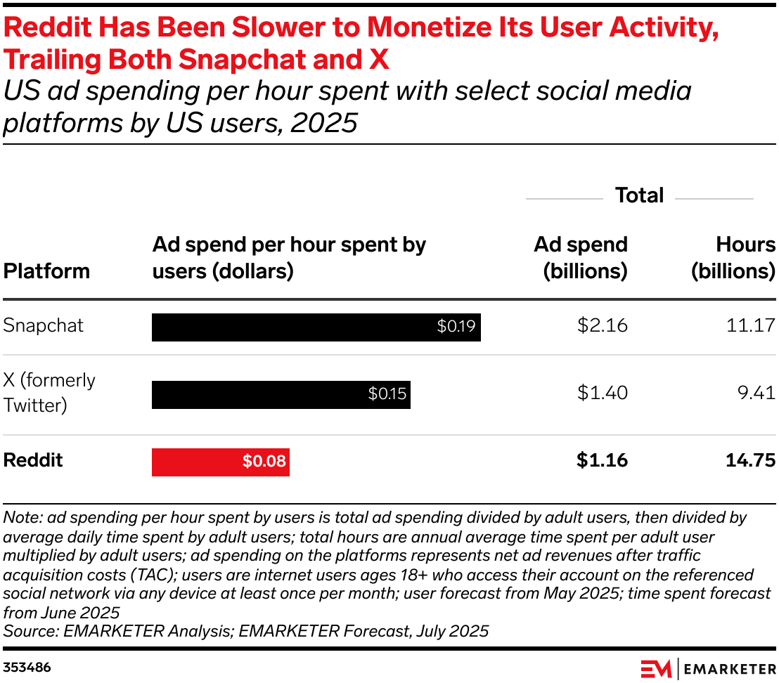 Reddit COO Jen Wong told EMARKETER that the platform has evolved from explaining itself to advertisers to proving it can deliver results. “We’ve shown Reddit can drive real business outcomes,” she said, noting that nine of fifteen verticals grew ad spend by at least 50% YoY. Wong emphasized discovery as Reddit’s next frontier—especially in underexposed sectors like parenting and sports—and said product improvements will make communities easier to find. With ad revenues projected to climb 46.6% in two years, Reddit’s opportunity is one of scale and visibility, driven by authenticity and high-intent engagement.