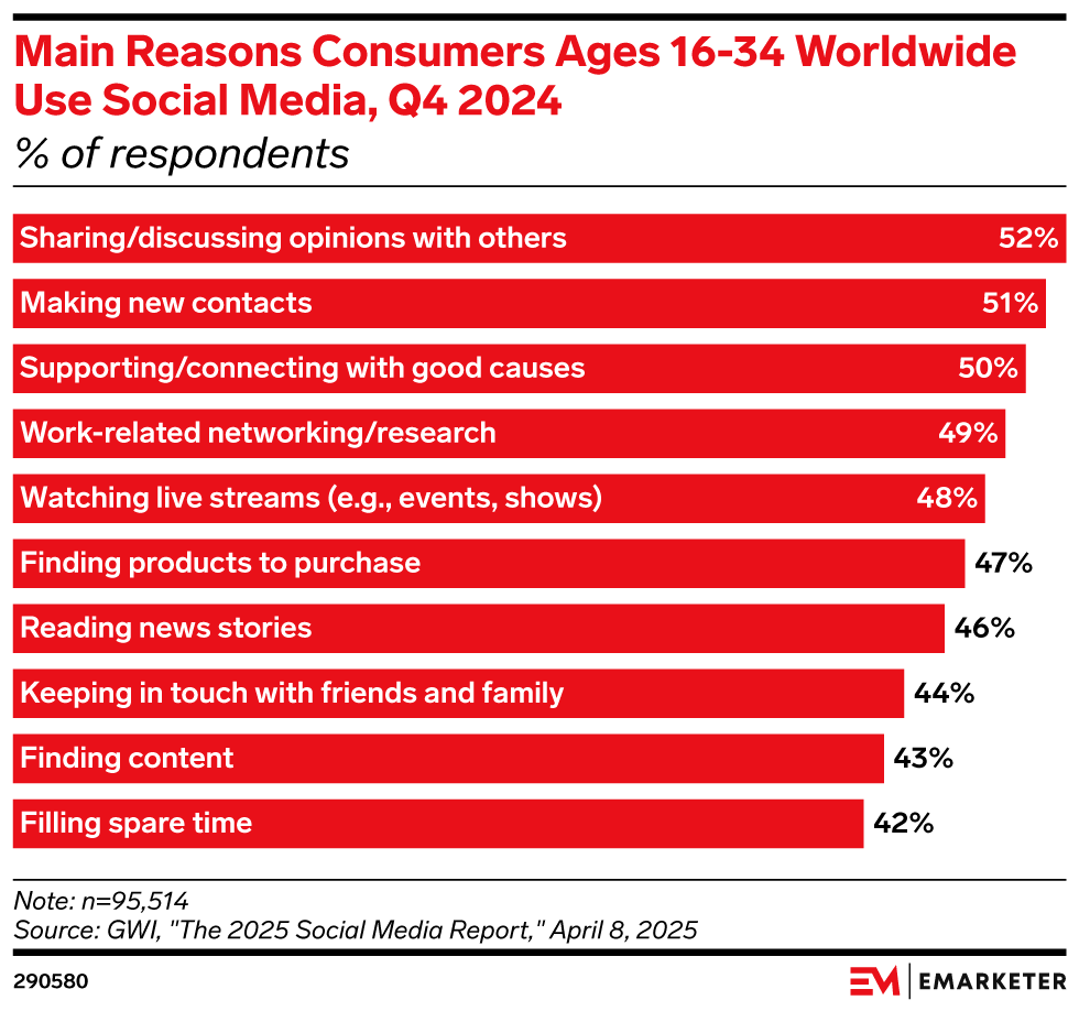 YouTube is an effective channel for reaching Gen Zers as use and creators influence expand, per our 2025 Gen Z Social Media Usage report. Over half (56%) of Gen Z social media users are spending more time on YouTube than they did a year ago, per YouGov. YouTube’s momentum with Gen Z shows its evolution from an entertainment hub to a discovery and shopping engine. Brands need to not only show up, but also design for searchability, optimize creator partnerships, and explore cross-screen viewing and messaging outreach.